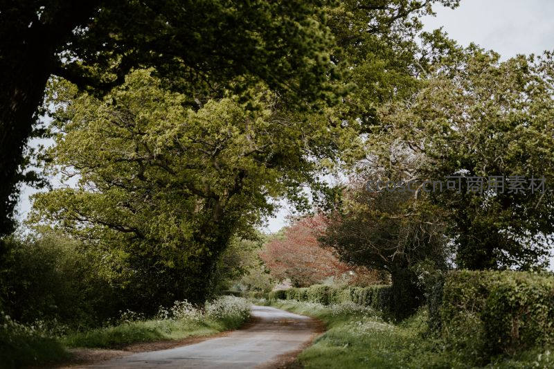 一条被茂密绿树和白色野花环绕的乡间小路,路面湿润,远处隐约可见栅栏,营造出静谧安详的田园氛围。