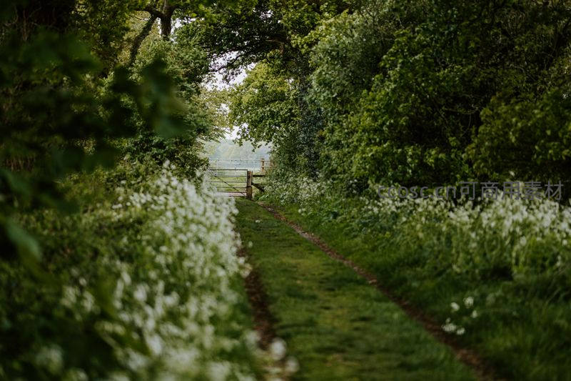 一条被浓密树木和盛开白色野花夹道的小径,通向远处的木门,光影斑驳,空气清新,仿佛步入童话般的秘密花园。