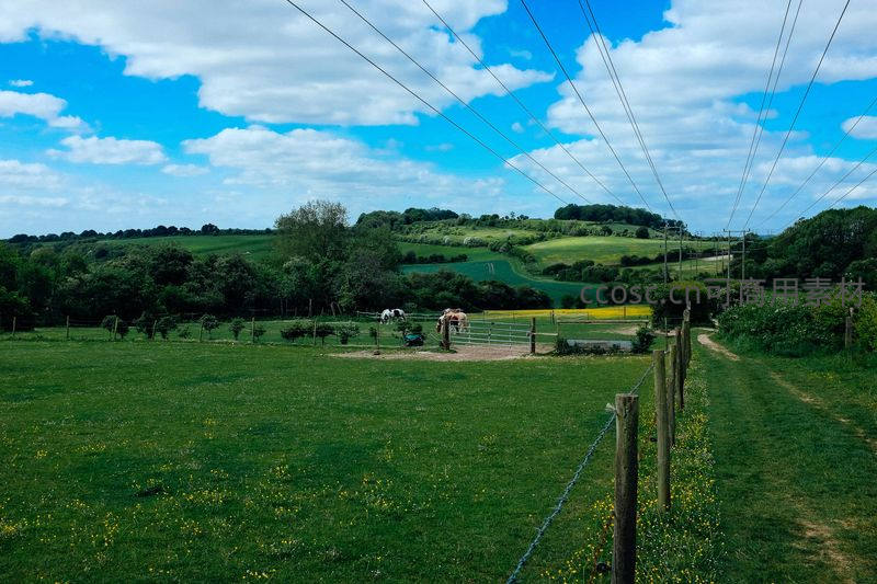 在绿意盎然的丘陵牧场中,几匹马在围栏内悠闲踱步,背景是连绵起伏的山峦和湛蓝天空,远处电线杆勾勒出现代与自然的交融。