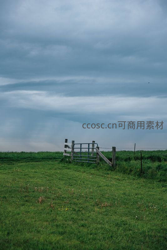 一片辽阔的绿色草地上,一扇孤零零的金属农场门矗立在阴沉乌云之下,营造出一种宁静却略带压抑的氛围,仿佛暴风雨将至。