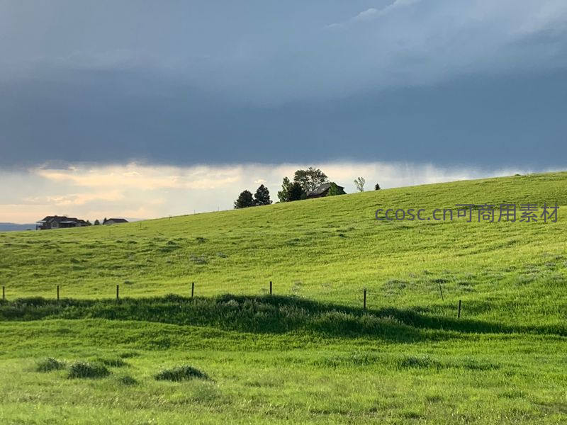 广阔的绿色山坡上,几座农舍点缀其间,远处乌云密布,预示着一场即将到来的雨,宁静中带着一丝戏剧性。
