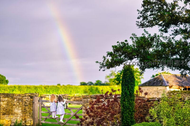 两个小女孩背对镜头,倚靠在木栅栏上,凝望天空中绚丽的彩虹,身后是石墙环绕的花园和远处的田野,充满童话般的温馨。
