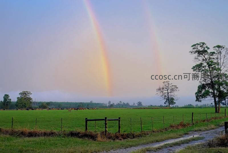雨后初晴,一道清晰的主彩虹与微弱的副虹横跨天际,下方是广袤的翠绿牧场,几头牛悠然吃草,木栅栏与孤树点缀其间,尽显大自然的温柔奇迹。