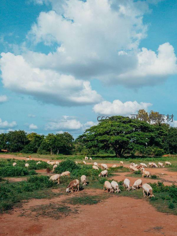 在一片开阔的红土地上,一群白羊低头啃食着青草,背景是茂密的绿树和棉花糖般的云朵,展现出一派悠闲自在的牧野风光。