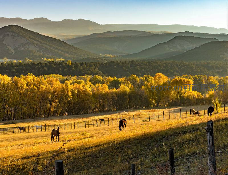 金色夕阳下,几匹马儿在辽阔的草地上悠闲吃草,背景是层叠起伏的山峦和染上秋色的树林,宁静而温暖。