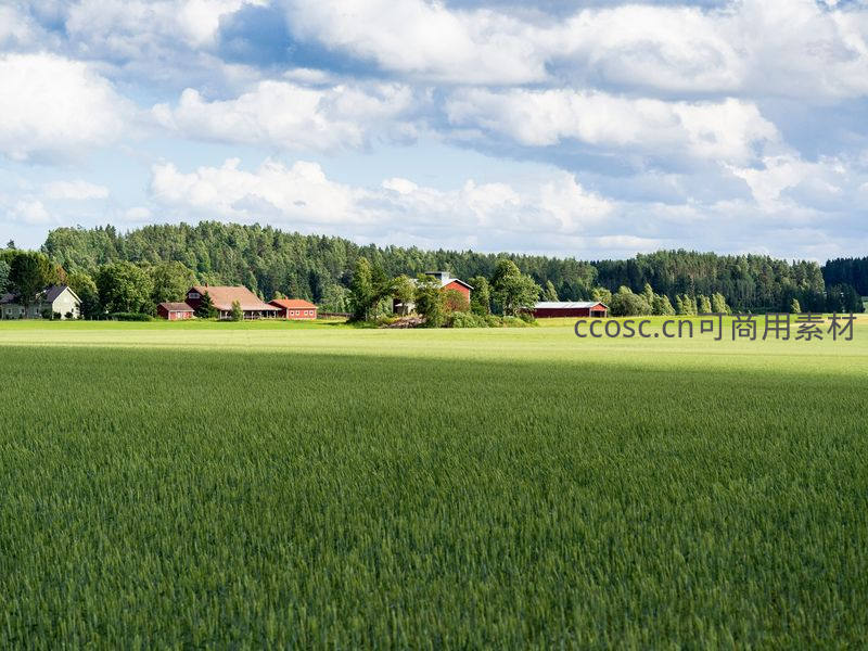 无垠的翠绿麦田延伸至远方,几座红顶白墙的农舍点缀其间,背后是茂密的森林,天空飘着朵朵白云,充满生机。