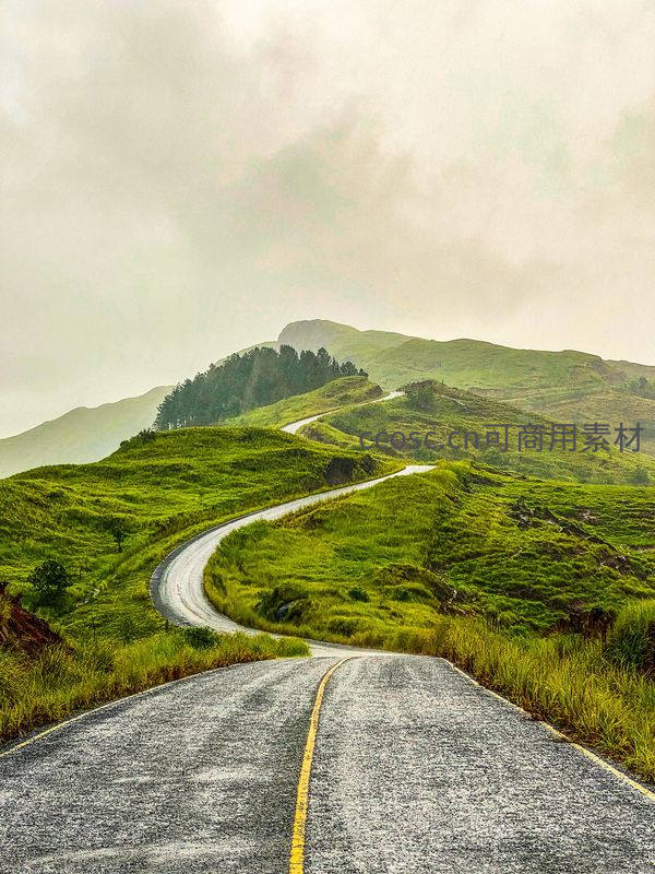 一条弯曲的柏油路穿过青翠的山丘,消失在云雾缭绕的山巅,两侧绿草如茵,仿佛通往秘境的旅途,引人遐想。