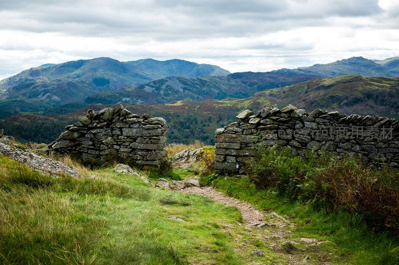 古老的石墙静卧在青翠山坡,一条土路蜿蜒向前,远处连绵山脉在云雾中若隐若现,展现原始而宁静的自然之美。