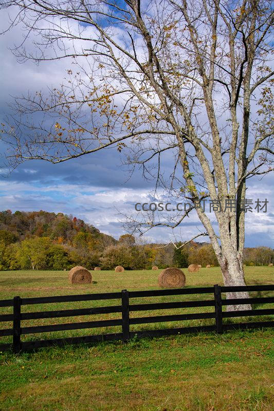 秋日牧场枯树下草垛与黑色围栏的田园风光