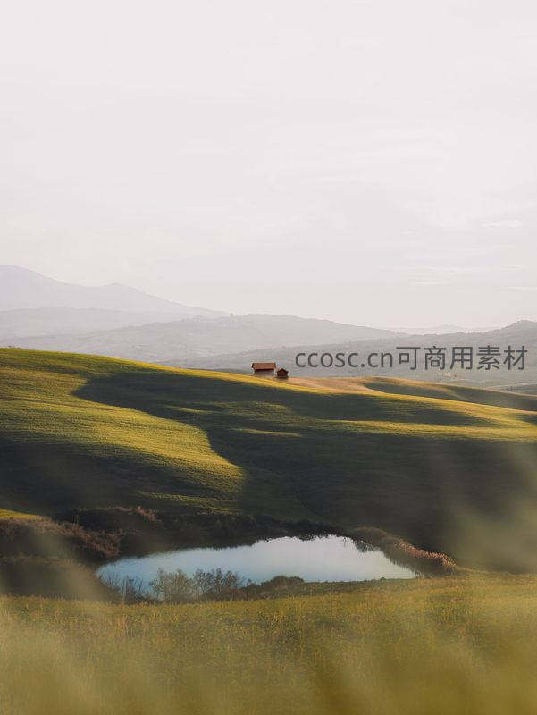 柔和晨光洒在起伏的金色草坡上,薄雾轻笼,山峦如黛,一汪小池如镜倒映天光,远方孤屋静立,尽显大地的温柔与辽阔。