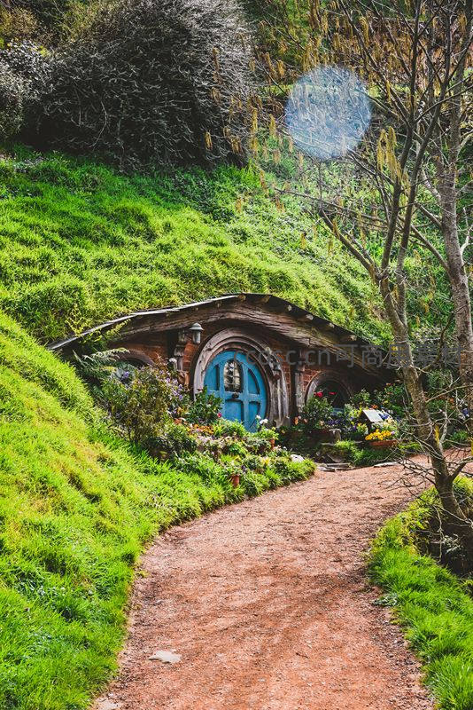 绿坡上的蓝色圆门霍比特人之家