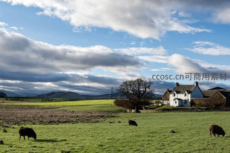 广袤的绿色牧场延伸至远方,几只黑羊悠然吃草,背景是典型的苏格兰风格白色农舍和壮丽多云的天空,宁静而开阔。