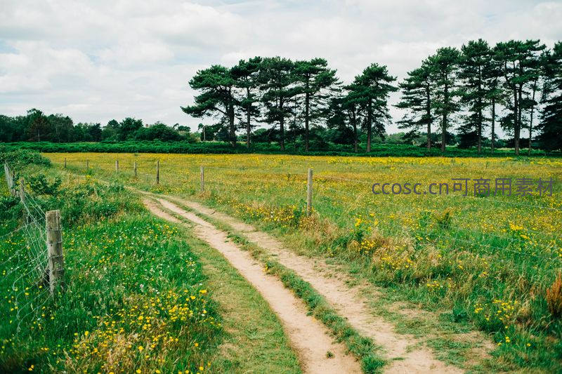 一条蜿蜒的土路穿过开满黄色野花的草地,两旁是整齐的木桩围栏和远处成排的松树,天空云层密布,营造出宁静悠远的乡村氛围。