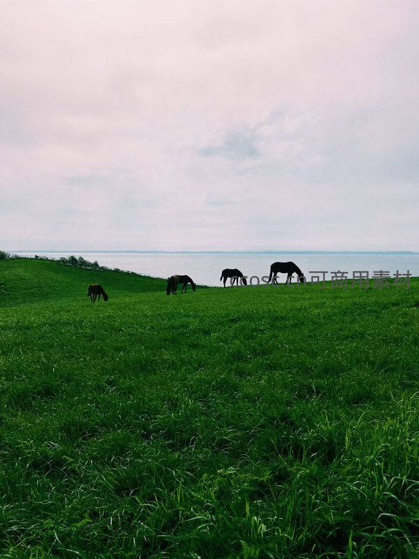 在辽阔的绿色草坡上,几匹马儿静静低头吃草,远处是平静的湖面和淡紫色天空,整个画面宁静祥和,充满自然野趣。
