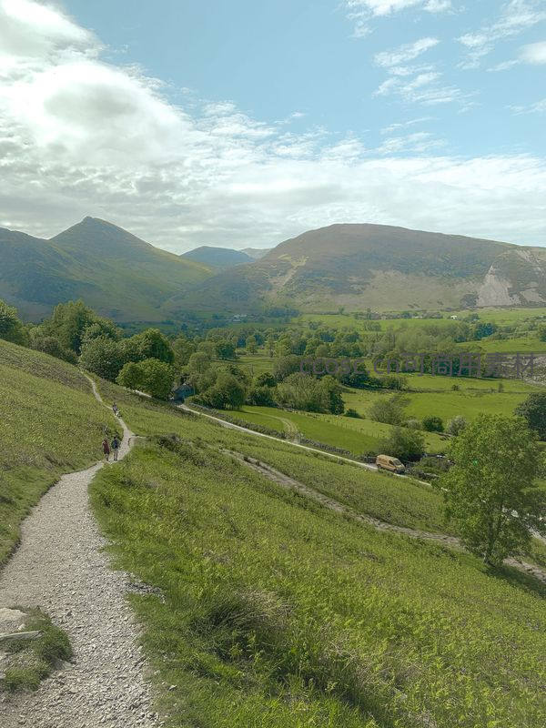 一条蜿蜒的碎石小径穿过青翠山坡,徒步者悠然前行,眼前是层叠起伏的绿色山谷和远山,尽显自然壮丽。