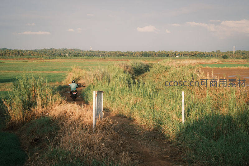 乡间摩托穿行芦苇丛中夕阳斜照