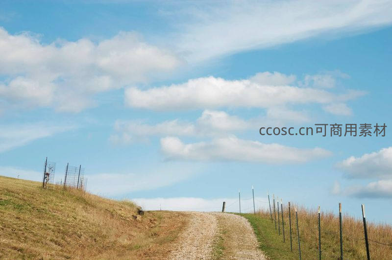 一条碎石小径沿着缓坡延伸,两旁是低矮围栏与干草,头顶蓝天白云辽阔无垠,营造出自由开阔、心旷神怡的田园意境。