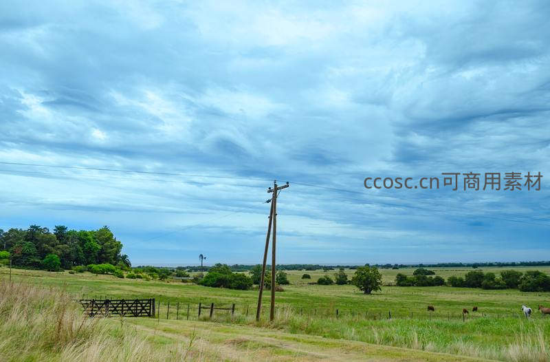 广袤无垠的草原上,一根孤独的电线杆矗立在风中,头顶是变幻莫测的云海,远处牛群点缀,尽显大自然的辽阔与苍茫。