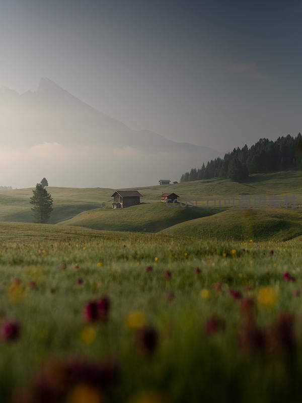晨雾轻笼起伏山丘,几座木屋散落其间,前景野花斑斓,背景峰峦隐现于云雾之中,营造出如梦似幻、空灵静谧的田园仙境意境。