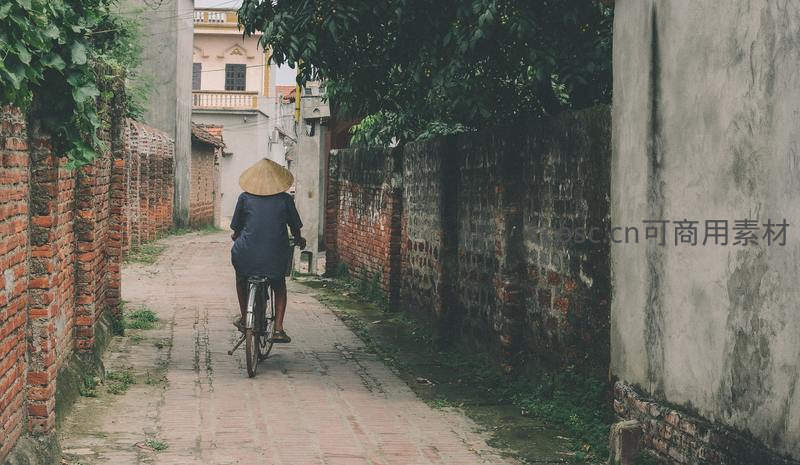 一位戴着传统斗笠的人骑着自行车,缓缓穿行于两侧红砖老墙的狭窄巷道中,绿树掩映,充满怀旧与宁静的生活气息。