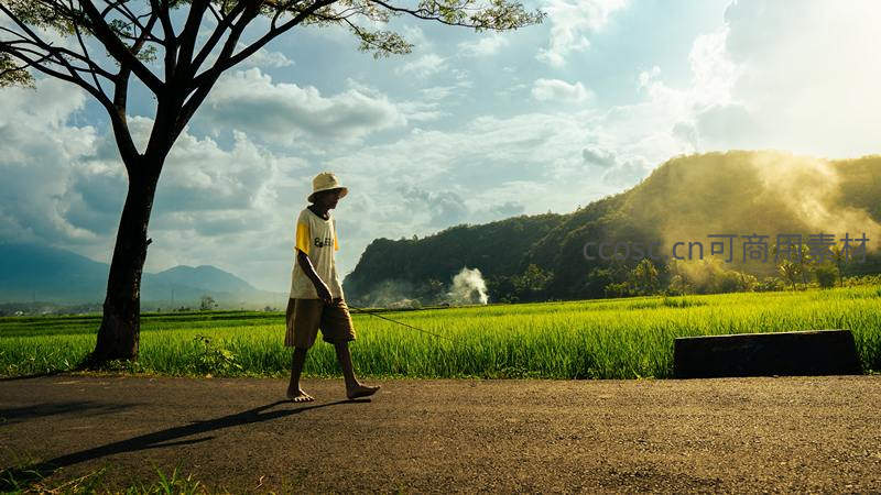 晨光洒在翠绿的稻田上,一位农夫沿着田埂缓步前行,远处青山缭绕薄雾,构成一幅宁静而诗意的田园风光画卷。
