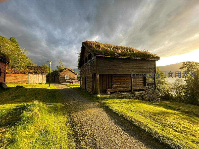 传统北欧草顶木屋矗立在湖畔山坡上,夕阳余晖穿透厚重云层,为古老的木质结构镀上金边,青翠草坪与远处湖水相映,尽显原始与诗意。