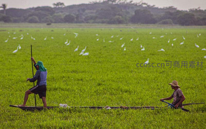 两位农民在碧绿的水田中划着小船,周围成群的白鹭悠然觅食,人与自然和谐共处,展现了传统农耕生活的宁静与诗意。