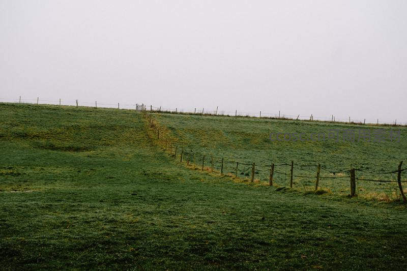 薄雾笼罩下,一片广袤的翠绿山坡延伸至天际,一道蜿蜒的木制栅栏静静划分着田野边界,营造出空灵而安宁的氛围,仿佛时间在此刻凝固。