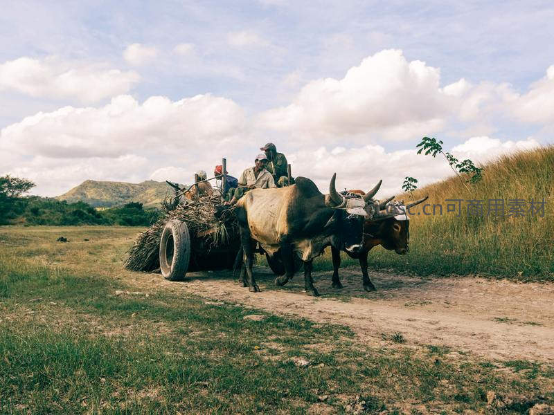 在广阔的田野上,两头健壮的牛拉着满载干草的木车缓缓前行,车上坐着几位农夫,背景是连绵的山丘与蓝天白云,展现着宁静而质朴的乡村生活。