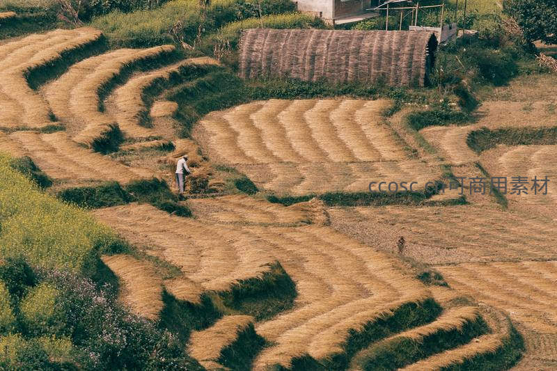 从高空俯瞰,层层叠叠的梯田如金色波浪般铺展,一位农人正弯腰劳作于田垄之间,远处茅草屋静立,构成一幅充满韵律感与生命力的秋收画卷。
