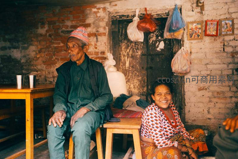 砖墙小屋内,一位戴帽老者与一位穿着民族服饰的妇女并肩而坐,墙上挂着神像与塑料袋,桌上摆放金属杯,温馨氛围中透出浓厚的生活气息与文化印记。