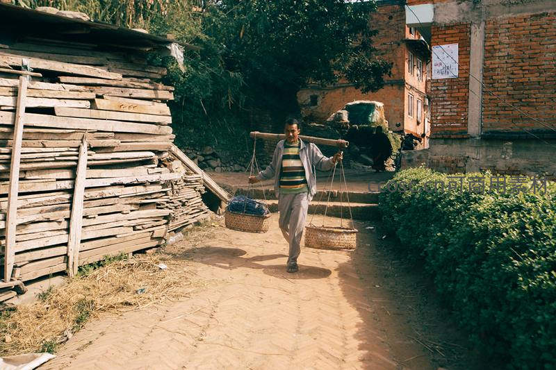 一名男子肩扛扁担,两端悬着沉甸甸的竹篮,行走在阳光洒落的泥土村道上,身旁是木柴堆和红砖房,展现出日常劳作归家的真实场景与乡土韵味。