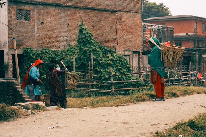 几位身着传统服饰的乡村妇女背着竹筐,行走在泥土小径上,背景是红砖老屋和爬满藤蔓的篱笆,展现宁静的田园劳作日常。