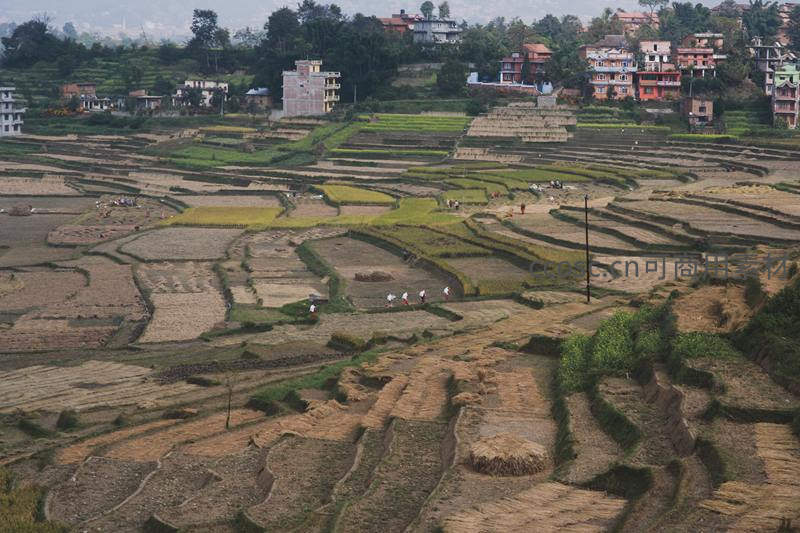 从高空俯瞰层层叠叠的梯田,部分已收割晾晒,远处山坡上错落分布着彩色民居,几位农人在田间辛勤劳作,构成一幅和谐的田园画卷。
