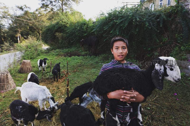 少年怀抱黑羊站在羊群中微笑望向镜头