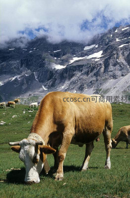 一头健硕的黄白花奶牛正低头在青翠的高山草甸上悠闲吃草,身后是雄伟的灰色岩壁和皑皑白雪,朵朵白云缭绕山巅,构成一幅宁静和谐的牧歌图景。