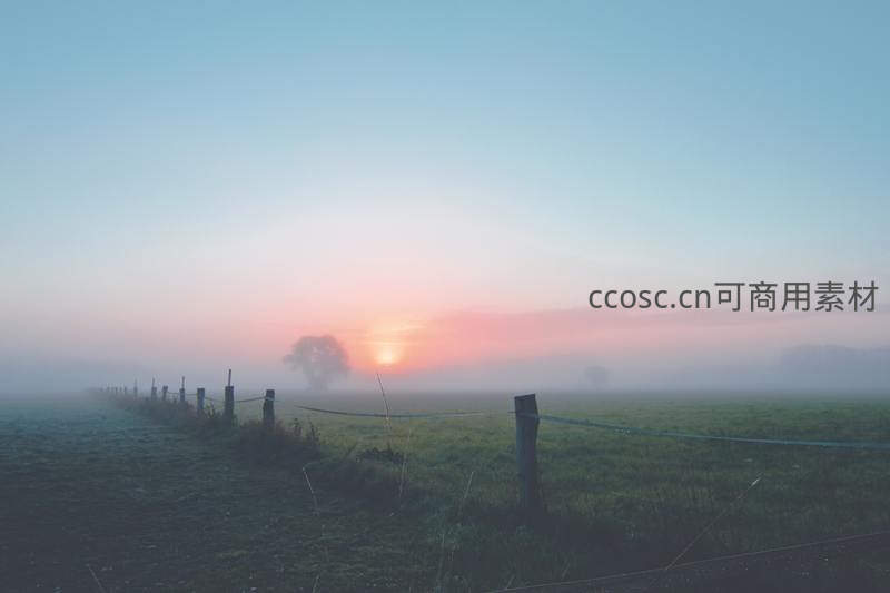 薄雾笼罩着无垠的绿色田野,一轮红日从地平线缓缓升起,染红天际,木桩围栏延伸至远方,营造出梦幻而宁静的清晨意境。