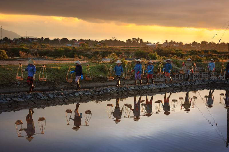 一群头戴斗笠的渔夫肩挑竹篓沿水渠缓行,水面倒映人影与晚霞,勾勒出一幅充满诗意的乡村劳动画卷。