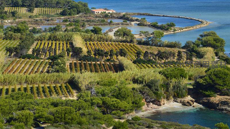从高空俯瞰,整齐排列的葡萄园紧邻蔚蓝海岸,蜿蜒水道穿插其间,绿意盎然的植被与清澈海水相映成趣,构成一幅和谐的滨海农业画卷。