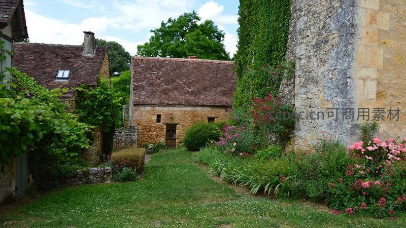 一座被青藤覆盖的古老石墙庭院,绿草如茵,各色花卉竞相绽放,背景是红瓦石屋,在阳光下显得古朴而生机勃勃,充满欧洲乡村的浪漫情调。