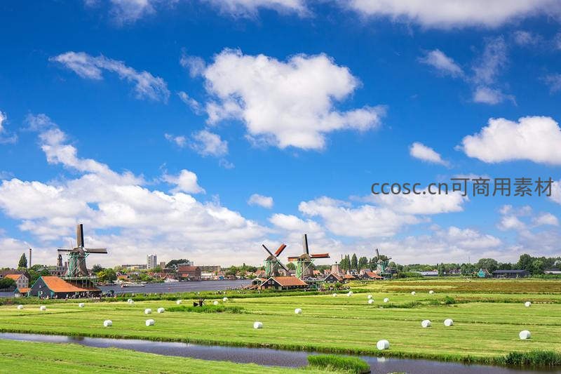晴朗的蓝天白云下,标志性的荷兰风车矗立在翠绿田野旁,河渠纵横,草垛点缀其间,远处村落隐约可见,展现经典而宁静的荷兰田园美景。