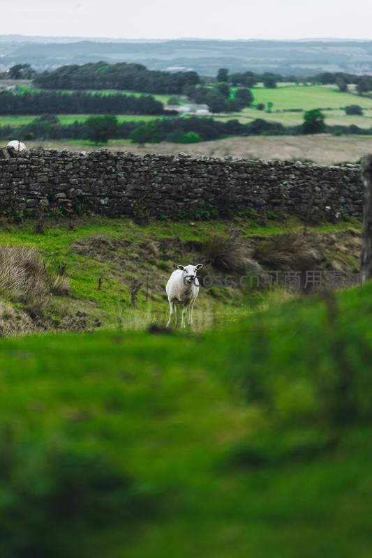 一只洁白的绵羊站在古老的石墙前,好奇地凝视着镜头,身后是连绵起伏的绿色丘陵,营造出一种质朴而宁静的乡村氛围。