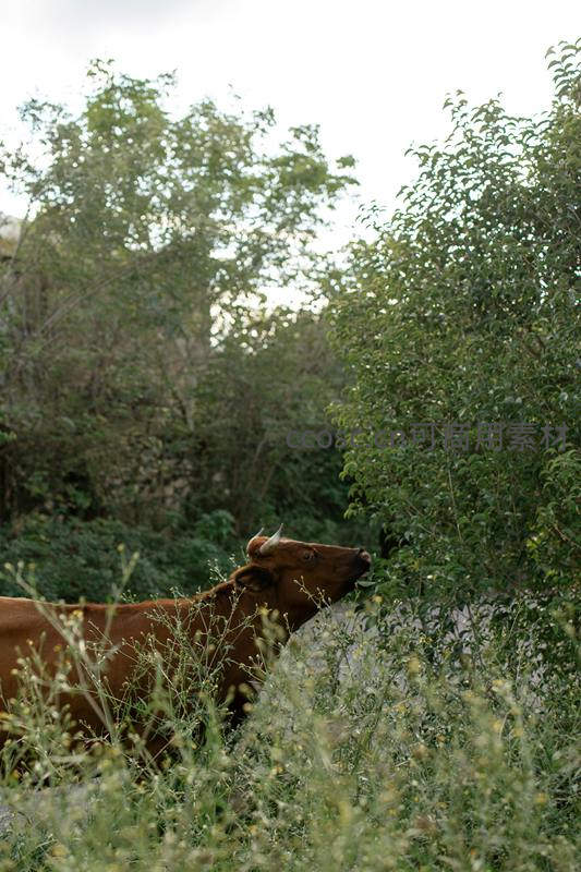 一头健壮的棕色牛在茂密灌木丛边低头啃食嫩叶,周围野花点缀,背景是郁郁葱葱的树林,充满田园牧歌气息。