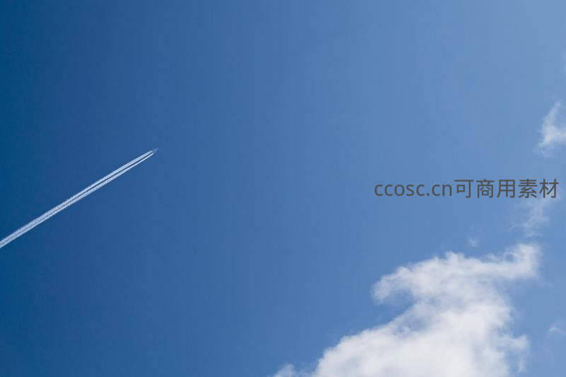 纯净无瑕的蔚蓝天空中,一架飞机飞过留下一道清晰的白色航迹,右下角点缀着几缕轻盈的白云,象征着自由与远行。