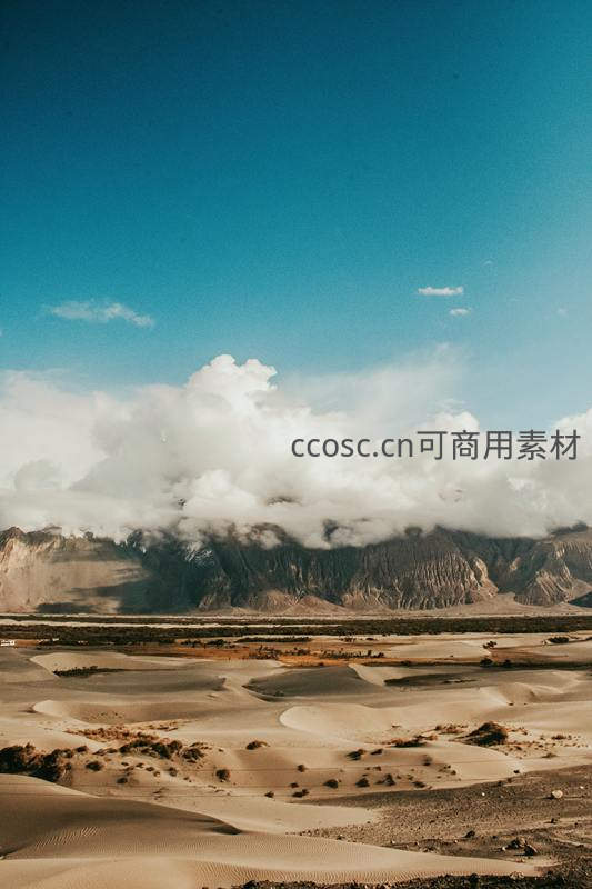 沙漠丘陵连绵起伏,云雾缭绕山巅
