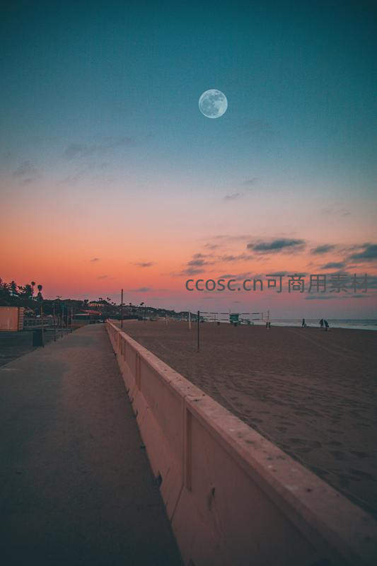 月圆之夜海滩步道旁晚霞绚烂