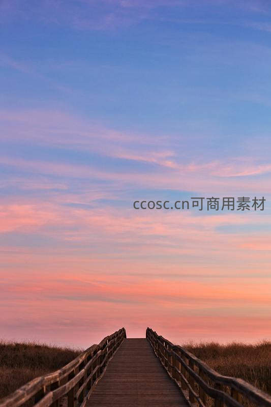 一条木质栈道延伸至绚丽霞光的远方,两侧草丛静谧,引导观者步入诗意黄昏,感受自然之美。