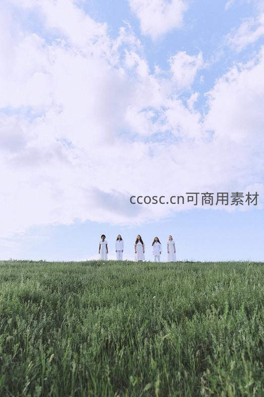 五位身穿白衣的少女静静伫立在翠绿草地上,抬头仰望蓝天白云,画面纯净美好,充满青春与诗意。