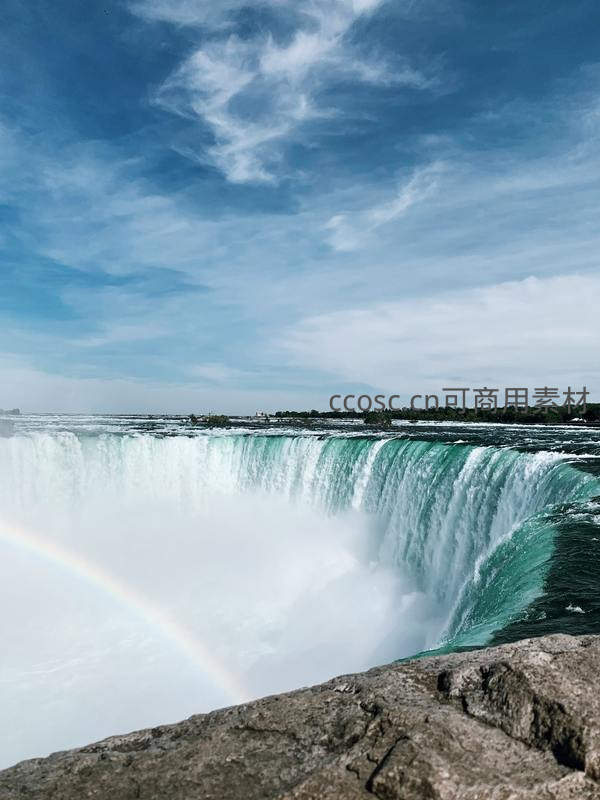 宏伟的瀑布从高处倾泻而下,激起漫天水雾,在阳光照射下形成一道绚丽的彩虹,蔚蓝天空与苍翠山峦相映成趣,景色震撼人心。