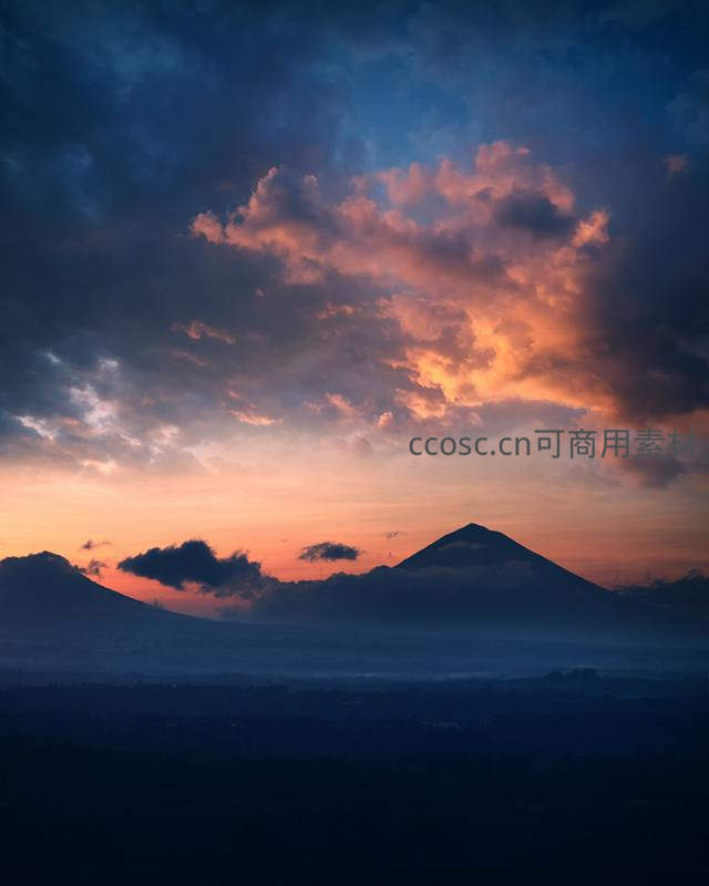 夕阳西下,绚烂的橙红色霞光染红了半边天际,远山的轮廓在光影中化作深邃剪影,厚重的云层翻滚变幻,构成一幅壮美而宁静的画卷。
